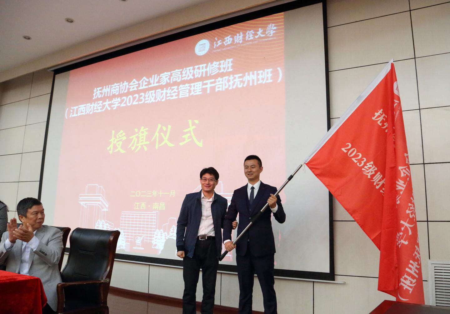 抚州商协会企业家高级研修班(江西财经大学2023级财经管理干部抚州班)班长,抚州市民建企业家协会执行会长、抚州中垣实业有限公司董事长吴俊作为学员代表上台发言,并接过宁亮授予的班旗。